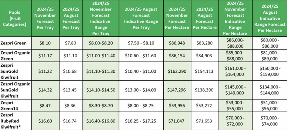 Zespri ha pubblicato di recente le sue previsioni per la stagione 2024-25, che evidenziano un aumento dei risultati attesi in quasi tutte le categorie rispetto all'ultima previsione di agosto – come si legge su portalfruticola.com. Le rese previste per ettaro sono aumentate in tutte le categorie tranne che su RubyRed. I livelli sono record per Green e Organic Green, grazie al miglioramento delle rese e al mantenimento di quotazioni elevate sul mercato. Anche per SunGold le aspettative sono aumentate rispetto ad agosto, mentre rimangono stabili per Green14 e RubyRed.