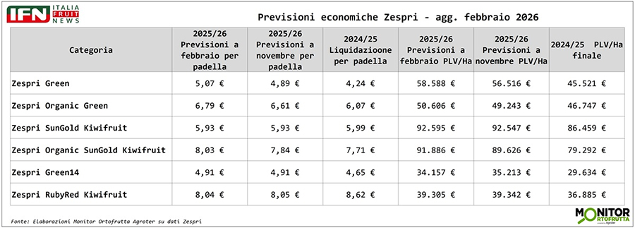 La prossima settimana il comparto si ritroverà a Mount Maunganui per la conferenza Momentum 2026, dove Zespri è pronta a condividere la strategia 2035, orientata a creare valore per coltivatori e azionisti con l’ambizione di diventare il marchio di frutta più sano al mondo. I risultati finali di stagione saranno pubblicati a maggio. Nel frattempo, il gruppo neozelandese ha diffuso le previsioni economiche di febbraio 2025/26 per padella e per ettaro: da segnalare la trasparenza del dato e livelli di redditività attesi interessanti, con una PLV/ettaro del kiwi verde prevista a quasi 60 mila euro, in crescita rispetto ai 45 mila dell’anno precedente. Best performer il SunGold, con una PLV oltre 90 mila euro, in lieve aumento rispetto agli 86 mila della passata campagna. (lg)