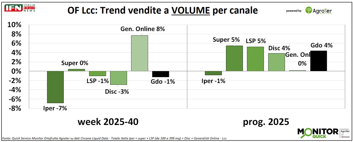 Nella settimana 40 le vendite a volume di ortofrutta a peso imposto restano in calo, ma il trend negativo si attenua rispetto alle settimane precedenti, mentre il prezzo medio mix risulta pressoché stabile. Tra i canali fisici, solo i supermercati segnano una crescita, seppur minima, mentre negli altri casi si registra una flessione; l’online, invece, continua a crescere.