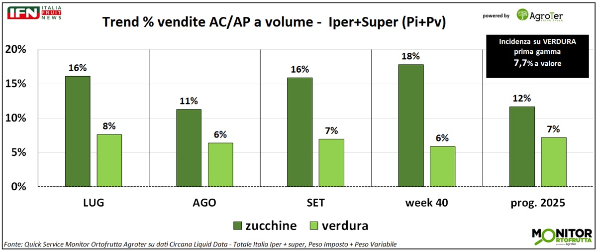 Le zucchine rivestono un ruolo di primo piano nelle vendite di ortaggi di prima gamma: da inizio anno si collocano al terzo posto per valore, con una quota pari al 7,7% per gli ipermercati e supermercati della Gdo nazionale. I trend a volume risultano decisamente positivi e superiori rispetto alla media del comparto verdura, segnando una crescita del +12% da gennaio, a fronte del +7% della macrocategoria. Questo divario si amplia ulteriormente nel periodo estivo e, soprattutto, nella prima parte dell’autunno, raggiungendo il +16% a settembre e il +18% nella settimana 40, mentre la verdura nel complesso si mantiene su livelli analoghi al progressivo annuo.