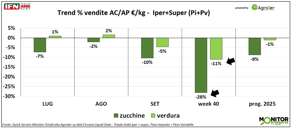 Nel complesso, anche le vendite a valore delle zucchine risultano positive da inizio anno (+2%), grazie a una crescita dei volumi (+12%) che, in termini assoluti, compensa ampiamente la contrazione del prezzo medio mix (-9%). Nella settimana 40, tuttavia, questa dinamica si inverte: il valore registra un calo del 15%, determinato da un forte ribasso dei prezzi al consumo, superiore all’aumento dei volumi, che pur restano in significativa crescita (+18%). (bf)