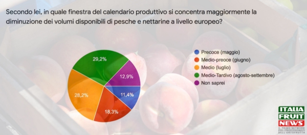 Nel sondaggio abbiamo poi spostato l'attenzione verso lo scenario europeo. Le legittime attese di prezzi più alti per la produzione italiana, una volta che questa deve competere in chiave export, fanno i conti con le realtà dei competitor, a partire da Spagna e Grecia. Un 13% dei rispondenti non ha elementi sufficienti per valutare in quale fase del calendario produttivo europeo si concentrerà la maggior contrazione di volumi di pesche e nettarine, mentre il 57% è convinto che il buco produttivo lo vedremo tra questo mese e il prossimo.