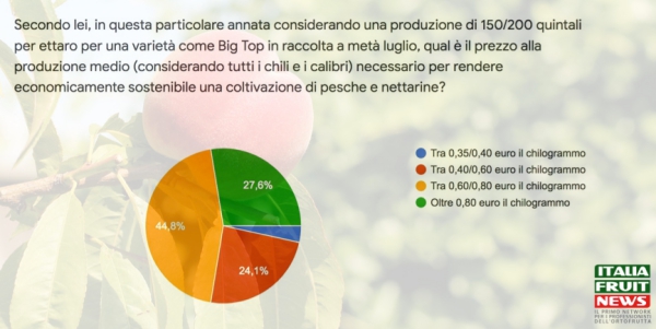 Gli operatori della filiera hanno un'idea piuttosto chiara sul prezzo alla produzione che, in questa campagna dai volumi ridotti, dovrebbero avere pesche e nettarine. Il nostro sondaggio della scorsa settimana (clicca qui per leggerlo) ha dato un risultato netto: considerando una produzione di 150/200 quintali per ettaro per una varietà come Big Top in raccolta a metà luglio - questo il parametro dato come riferimento - per il 44,8% dei rispondenti ci si dovrebbe attestare su una forbice tra 0,60 e 0,80 euro il chilogrammo per rendere la produzione economicamente sostenibile. Mentre per il 27,6% si dovrebbe oltrepassare quota 0,80 euro il chilo.
