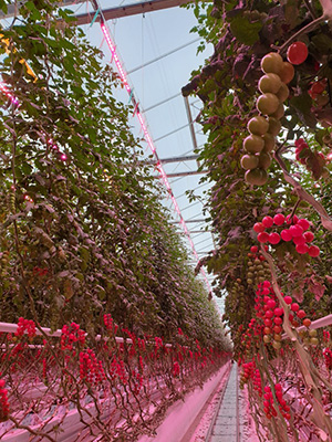 Infatti, dalle successive prove, effettuate presso l’azienda sperimentale “La Noria” dell’Ispa-Cnr di Bari, con l’utilizzo di moduli LEDs interlighting, è risultato che l’illuminazione supplementare LEDs con spettro rosso + blu incrementa di circa il 25% la produzione di pomodoro da mensa in un ciclo autunno-invernale. Mentre apportando anche lo spettro rosso lontano come radiazione supplementare, non sono emersi particolari vantaggi. Quindi, nel 2019 l’azienda agricola Lapietra ha installato su 8.000 m2 un impianto Led toplighting con spettro rosso + bianco + blu, riuscendo ad incrementare di circa il 25% la produzione di pomodoro ciliegino e datterino nel periodo compreso tra dicembre 2019 e marzo 2020. Da quest’ultima attività sperimentale è anche emerso che le piante coltivate con illuminazione supplementare incrementano il numero di grappoli prodotti e la velocità di fioritura, e che l’efficienza di utilizzo della radiazione luminosa varia in funzione del genotipo. Pur determinando un incremento delle produzioni, i Led non causano una riduzione dei composti bioattivi dei frutti: polifenoli, carotenoidi, vitamina C, acidità titolabile, calcio, potassio e magnesio sono paragonabili o superiori a quelli riscontrati nei frutti ottenuti con sola radiazione naturale.
