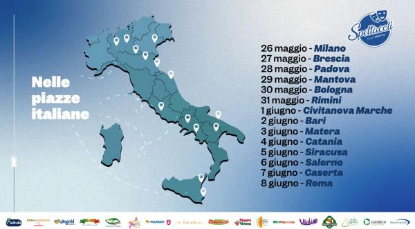 Spettacoli alla Frutta è un'idea promossa da 17 aziende in rappresentanza di altrettante eccellenze e brand ortofrutticoli: Bestack, Comieco, Consorzio della Ciliegia di Vignola Igp, Consorzio del Melone Mantovano Igp, Consorzio del Pomodoro di Pachino, DimmidiSì, Dolce Lucano, Melinda, Metis, Jingold, Op Armonia, Oranfrizer-Unifrutti, Selenella, Solarelli, Valfrutta, Violì, Viviana. L'iniziativa ha il patrocinio del Mipaaf.