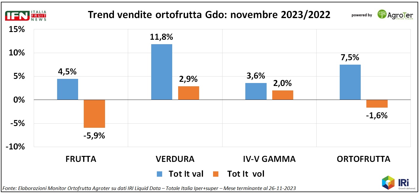 Dopo un inizio autunno positivo per i consumi della Gdo italiana (ipermercati e supermercati +3,1% a ottobre), a novembre il trend delle vendite a volume torna in negativo (-1,6%). A livello di macrocategorie, è evidente l’impatto della frutta (-5,9% a volume) sul risultato del reparto, mentre la verdura (+2,9%) e la IV-V Gamma (+2%) crescono, limitando le perdite. In particolare, è importante il segnale che stanno dando i prodotti servizio: questi, da inizio anno, hanno collezionato principalmente segni meno; poi, dopo un ottobre in crescita hanno confermato il trend anche a novembre. Una boccata di ossigeno per raddrizzare un po' un’annata storta.