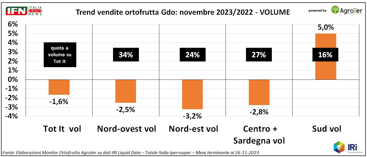 Dopo un ottobre con consumi in crescita, a novembre l’asticella torna sottozero per il reparto ortofrutta della Gdo e, tra le macrocategorie, la frutta è di certo quella che ha più responsabilità per questa performance deludente. Tuttavia, qualcosa di buono c’è: torna a crescere la IV-V Gamma che, insieme alla verdura, tamponano l’emorragia dei volumi nel reparto. A livello di aree geografiche, solo il Sud cresce nei consumi e lo fa in modo netto, ma ha un peso limitato sulla Gdo nazionale, che non basta per compensare il resto della Penisola. L'inflazione, dopo un rallentamento ad ottobre, a novembre torna a crescere, arrivando quasi alla doppia cifra.