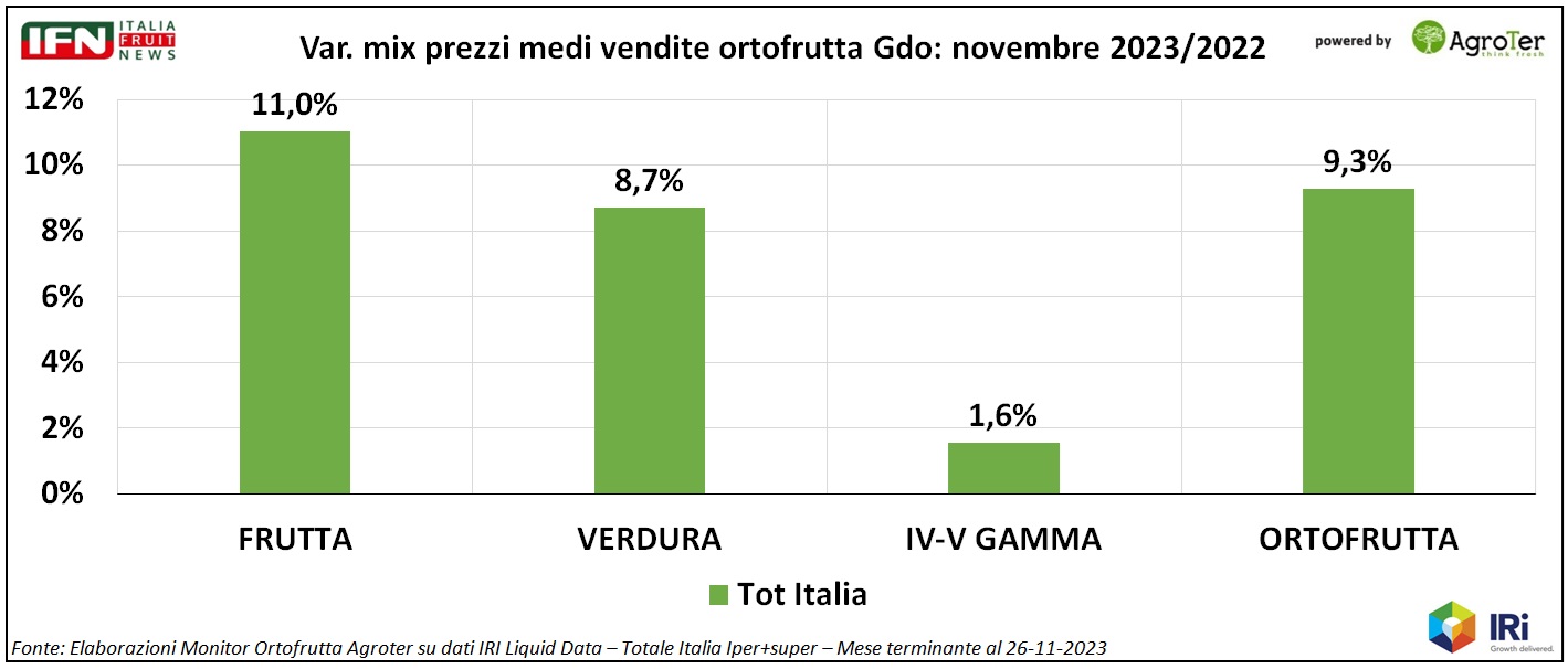 Un altro elemento da non sottovalutare nell’interpretazione dei consumi in contrazione è l’aumento dei prezzi medi. A novembre l’inflazione del reparto schizza al +9,3%, dopo un rallentamento significativo a ottobre (+3%). Non a caso, la macrocategoria che mostra il maggior aumento dei prezzi è la frutta (+11%), che è anche quella più in crisi sui volumi. Rimane comunque un’inflazione alta anche nella verdura (+8,7% a novembre), quando a ottobre era in deflazione, e abbastanza costante nella IV-V Gamma (+1,6% a novembre, +1,4% a ottobre).