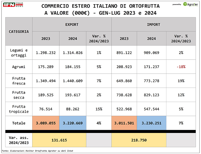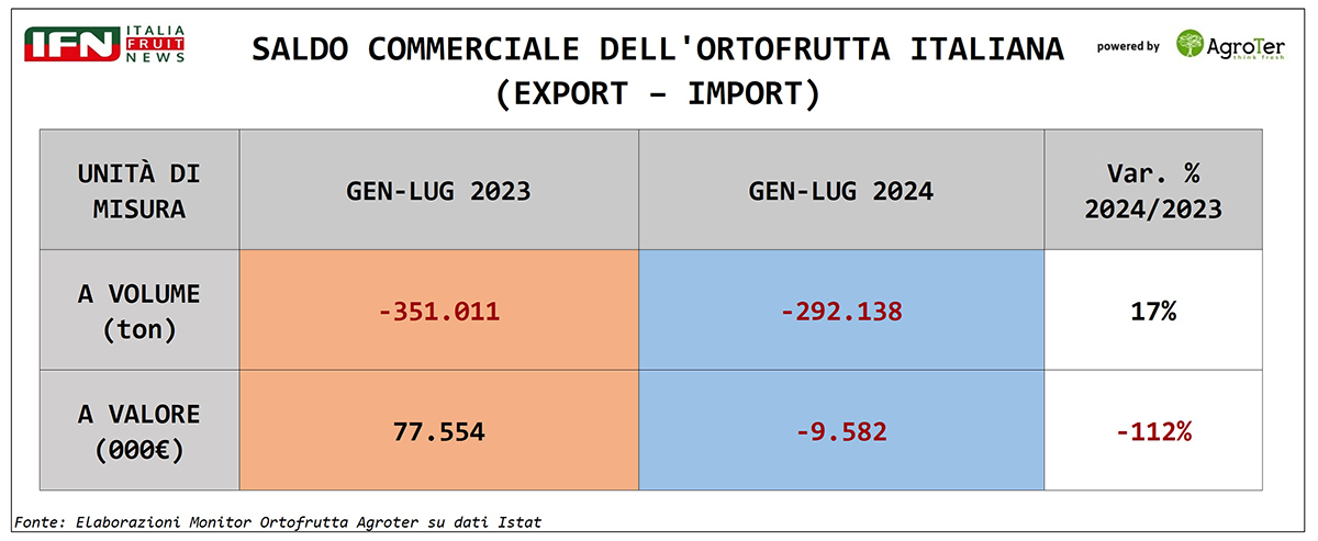 A luglio in rosso anche a valore il saldo commerciale ortofrutta