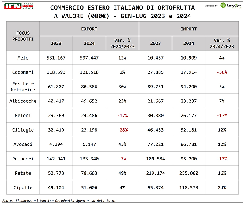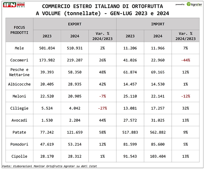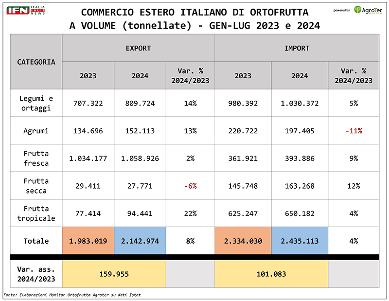 Secondo le analisi del Monitor Ortofrutta di Agroter sui dati Istat aggiornati a luglio, l'export italiano di frutta e verdura segna un incremento dell'8% a volume rispetto allo stesso periodo dell'anno precedente, con una crescita del 4% nel valore. Ma scendiamo ora nel dettaglio delle principali macrocategorie esportate.