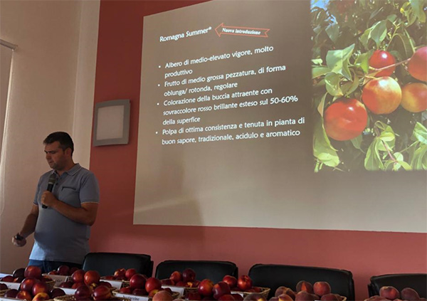 Sono state poi presentate le novità varietali della sperimentazione piemontese sul pesco, ad opera del ricercatore Davide Nari. Con una superficie di circa 60.000 ettari in Italia - inferiore rispetto ai 90.000 ha del 2010 - la coltivazione del pesco registra una situazione ancora più negativa in Piemonte, con soli 3.500 ha nel 2022, dimezzati rispetto ai 7.000 ha del 2012. Nonostante ciò, il 2022 ha registrato frutti dalla pezzatura tendenzialmente inferiore rispetto alle precedenti annate ma con qualità organolettiche eccellenti e un grado zuccherino medio superiore al 2021 di circa 2° Brix con un’acidità titolabile simile.