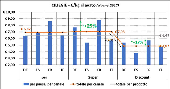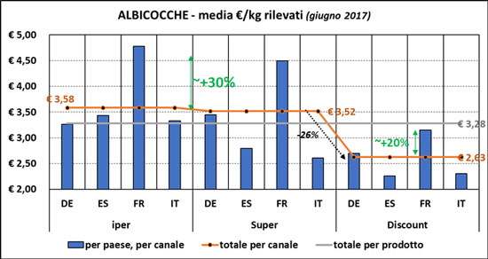 Tra i Paesi spicca infatti la Francia, con prezzi medi rilevati decisamente superiori alle media complessiva (+30% nelle albicocche e +25% nelle ciliegie). Negli altri Paesi si rilevano prezzi medi rilevati simili per gli ipermercati, mentre nel format supermercato Italia e Spagna si contendono i prezzi più bassi: vince la Spagna nelle ciliegie e l'Italia nelle albicocche, in entrambi i casi con prezzi medi più simili a quelli medi rilevati nel canale discount. Osservando i discount si nota un calo dei prezzi medi rilevati, rispetto alla media iper/super, del  26% nelle albicocche e del 30% nelle ciliegie. Un differenziale simile tra prodotti che hanno prezzi medi molto diversi (le albicocche circa la metà delle ciliegie).