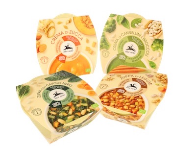 Le quattro zuppe fresche Alce Nero sono 100% biologiche e vegetali, preparate con olio extravergine d’oliva bio dei soci olivicoltori di Alce Nero e state studiate con il supporto di chef e nutrizionisti. Contengono ingredienti ad alto valore nutrizionale come la patata dolce, il sedano rapa, il cavolo nero e i legumi. Due le porzioni, già ponte da scaldare in microonde. Si va dalla crema di zucca con patata dolce e sedano rapa alla crema di cannellini e broccoli con spinaci e sedano rapa, per proseguire con la zuppa con cavolo nero, fagioli cannellini ed erbe aromatiche; ultima "combinazione" quella della zuppa di legumi con farro e semi di finocchio.