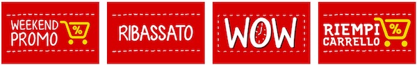 Quattro categorie di promozioni settimanali, video con le famiglie che hanno il nome del retailer