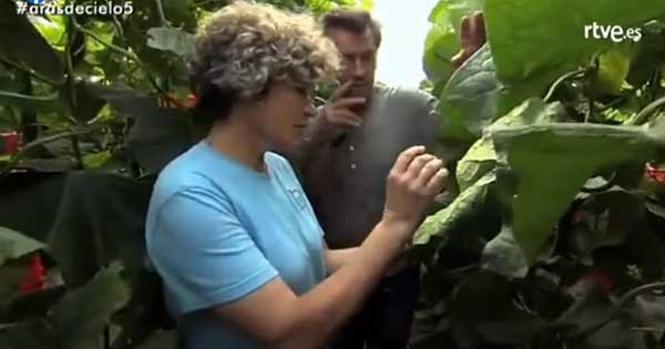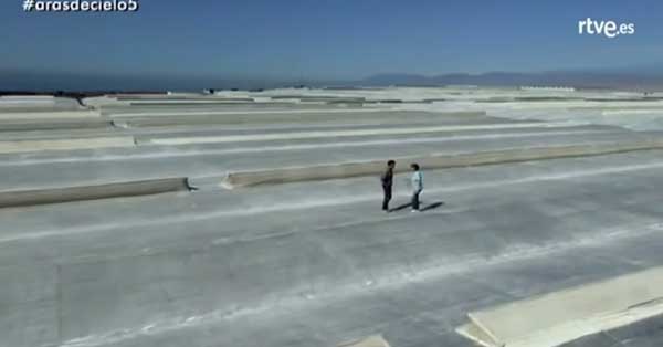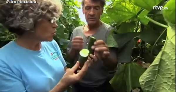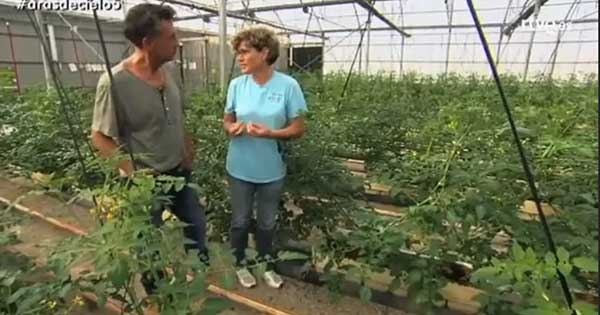 Una serra più moderna è dedicata da Gómez ai pomodori, “l’ortaggio più consumato in Spagna” dice il giornalista. La produttrice ne elenca i punti di forza: colture fuori suolo che crescono sulla fibra di cocco, un prodotto del tutto organico e sostenibile; irrigazione automatica; canaline per un recupero totale dell’acqua e dei nutrienti, con cui si evita anche la contaminazione della terra con i fertilizzanti.