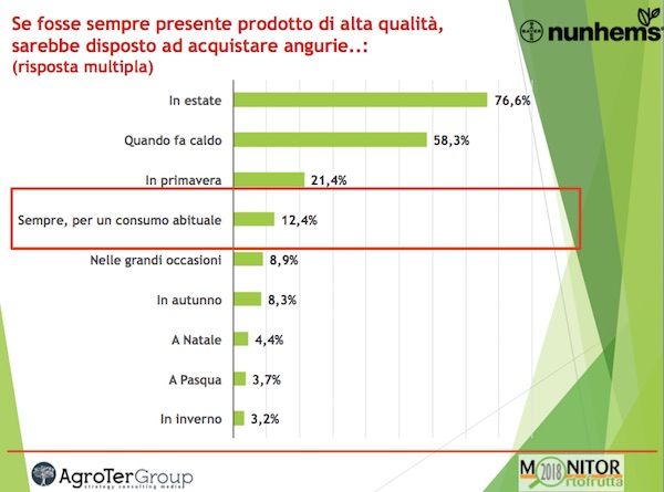 A proposito di costanza qualitativa, poi, c’è un’altra indicazione che arriva direttamente dal “cliente finale” interpellato dal Monitor Ortofrutta, vale a dire: se fosse sempre presente l’anguria di elevata qualità, il 12,4% dei consumatori sarebbe disposto ad acquistarla sempre.