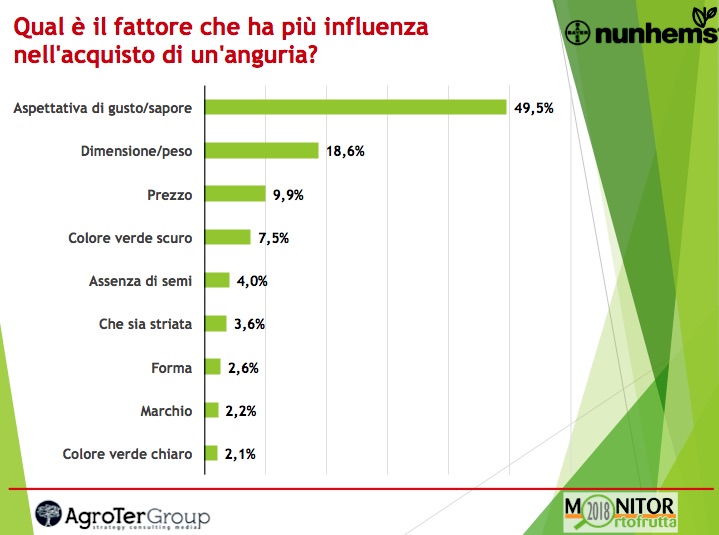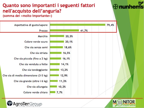 E, infatti, il fattore che più influenza l’acquisto di angurie è proprio l’aspettativa di gusto, indicata dal 49,5% dei responsabili acquisto, che stacca nettamente il fattore dimensione/peso scelto dal 18,6% (ecco l’ottica anti-spreco) e il prezzo che non arriva al 10%.