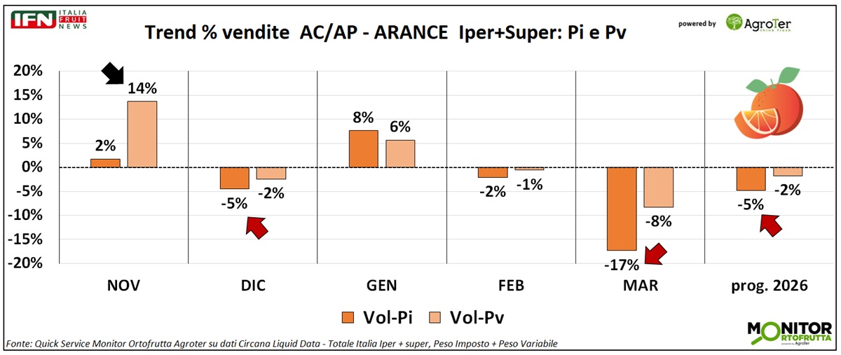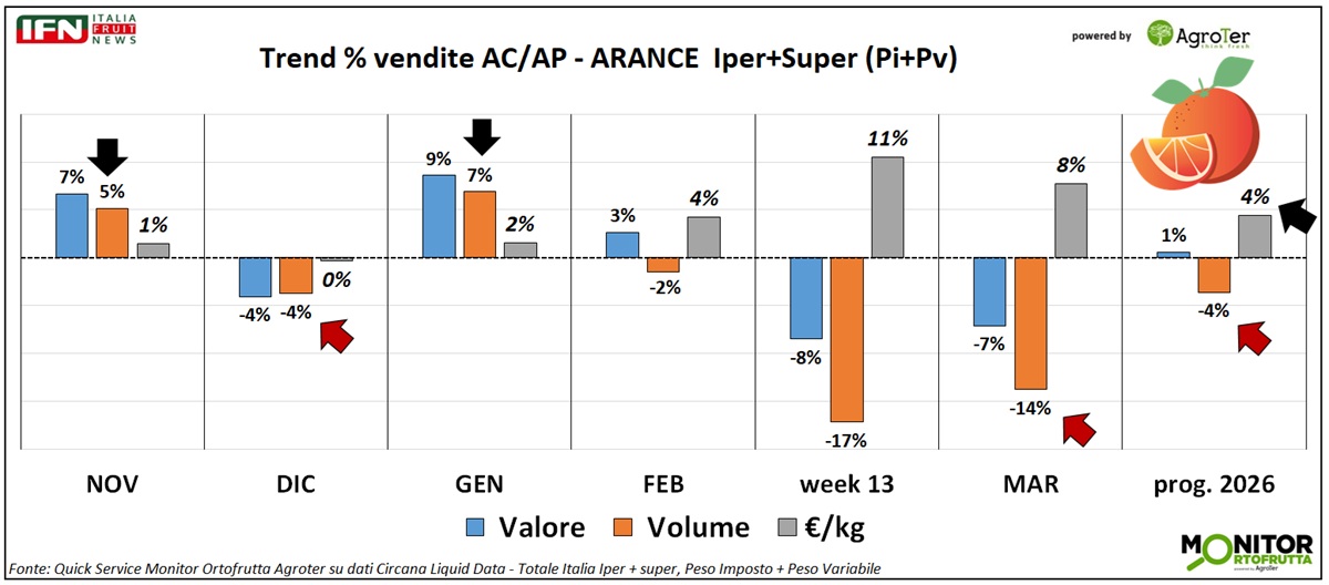 Le arance si avviano alla conclusione della fase principale della campagna, iniziata alla fine del 2025. I dati di vendita di ipermercati e supermercati evidenziano alcune difficoltà: solo nei mesi di novembre e gennaio si registra un trend positivo a volume (rispettivamente +5% e +7%), mentre negli altri mesi analizzati il dato è in calo, con una flessione particolarmente marcata a marzo (-14%). A valore, i risultati risultano migliori grazie alla crescita del prezzo medio mix. Nel primo trimestre, il bilancio complessivo resta comunque negativo a volume (-4%), con il solo mese di gennaio in aumento (+7%).
