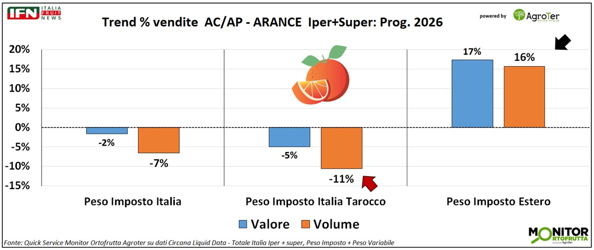 Entrando più nel dettaglio del prodotto a peso imposto nel primo trimestre 2026, emerge con ancora maggiore evidenza la difficoltà del prodotto nazionale, che registra una flessione del 7% a volume. All’interno di questo segmento, la tipologia Tarocco mostra la contrazione più marcata, arrivando al -11%, mentre il prodotto estero segna una crescita del 16%.