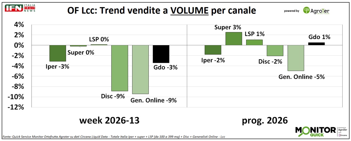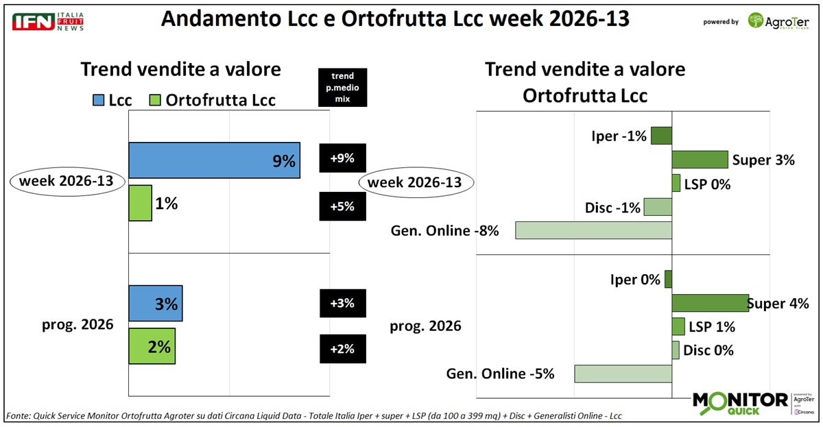 Prosegue anche nella settimana 13 la fase negativa delle vendite a volume dell’ortofrutta Lcc, mentre resta evidente l’effetto inflattivo già osservato nella settimana precedente, con trend a valore solo debolmente positivi. Il discount si conferma il canale più in difficoltà, mentre supermercato e libero servizio risultano sostanzialmente stabili.