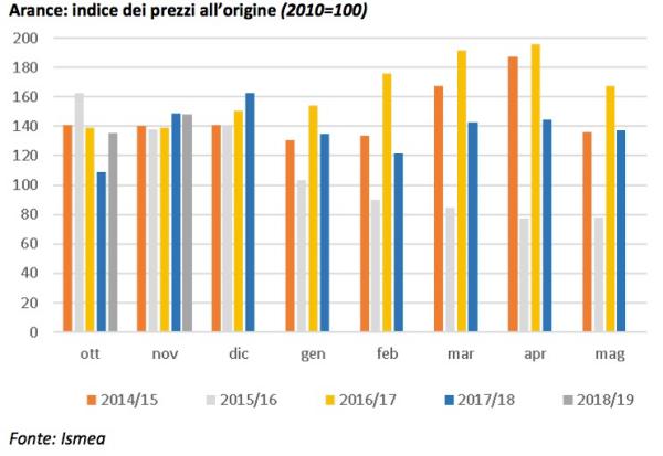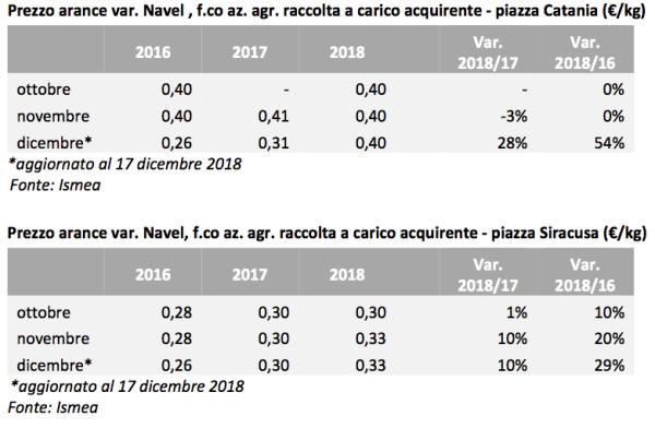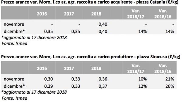 Capitolo prezzi. Il report evidenzia come la campagna commerciale delle arance 2018/19 sia iniziata sotto buoni auspici, con prezzi all’origine in aumento rispetto alla campagna 2017/18, ed in linea con la media delle ultime campagne. Visto che il maltempo ha ritardato la produzione spagnola, il prodotto italiano ne ha sicuramente tratto beneficio. "In dicembre, nonostante la pressione competitiva del prodotto spagnolo, i prezzi appaiono in lieve aumento sia rispetto a novembre sia rispetto a dicembre 2017", argomenta Ismea.