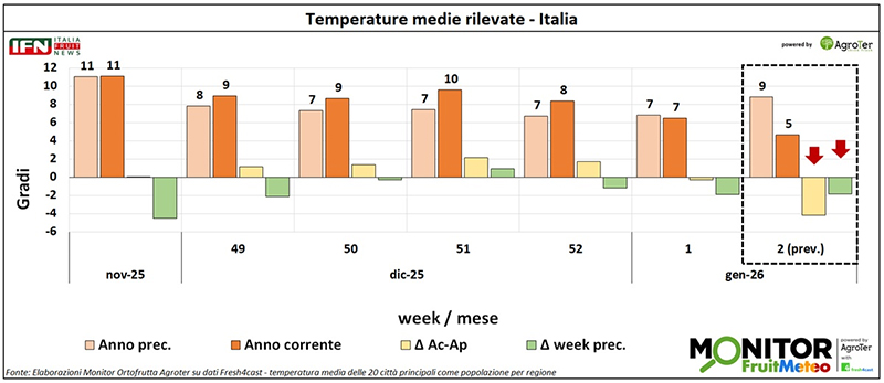 Per la settimana in corso, la numero 2 del 2026, è previsto un marcato calo delle temperature su tutta la Penisola, sia rispetto allo stesso periodo del 2025 sia rispetto alla settimana precedente. La media nazionale si attesta intorno ai 5 °C, contro i 9 °C registrati nel 2025 e i 7 °C della settimana 1 di quest’anno. Si tratta del primo raffreddamento significativo dopo diverse settimane caratterizzate da temperature simili o più elevate rispetto allo scorso anno.