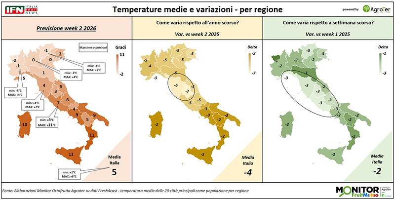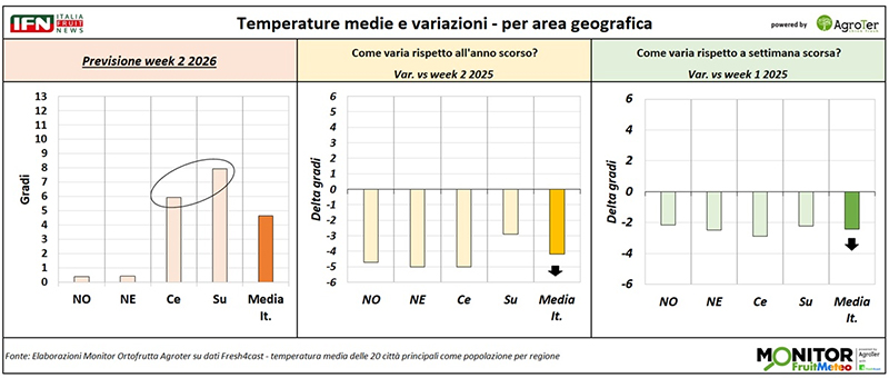 Le analisi del Monitor Ortofrutta si arricchiscono grazie a una nuova collaborazione dedicata a esplorare settimanalmente una variabile spesso decisiva per il settore ortofrutticolo: il meteo. Tra i diversi fattori che influenzano le condizioni climatiche, questa nuova rubrica si concentra in particolare sulle temperature medie registrate lungo la Penisola, con il supporto di Fresh4cast, una piattaforma software in cloud specializzata nella previsione della domanda e nell'ottimizzazione della supply chain per il settore ortofrutticolo.