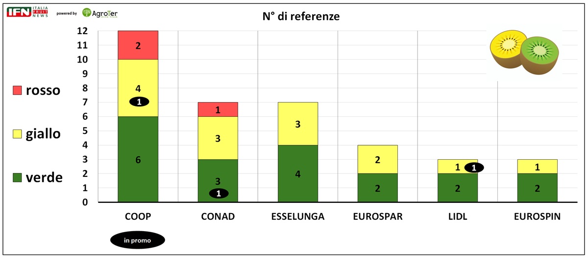 Coop si distingue nettamente dalle altre insegne per l’ampiezza dell’offerta, proponendo 12 referenze contro le 7 di Conad ed Esselunga e le 3-4 presenti negli altri punti vendita, due dei quali sono discount. La differenza emerge soprattutto nella categoria dei kiwi verdi, con 6 referenze a fronte delle 3-4 disponibili nei supermercati di maggiori dimensioni e delle 2 presenti in Eurospar e nei discount Lidl ed Eurospin.