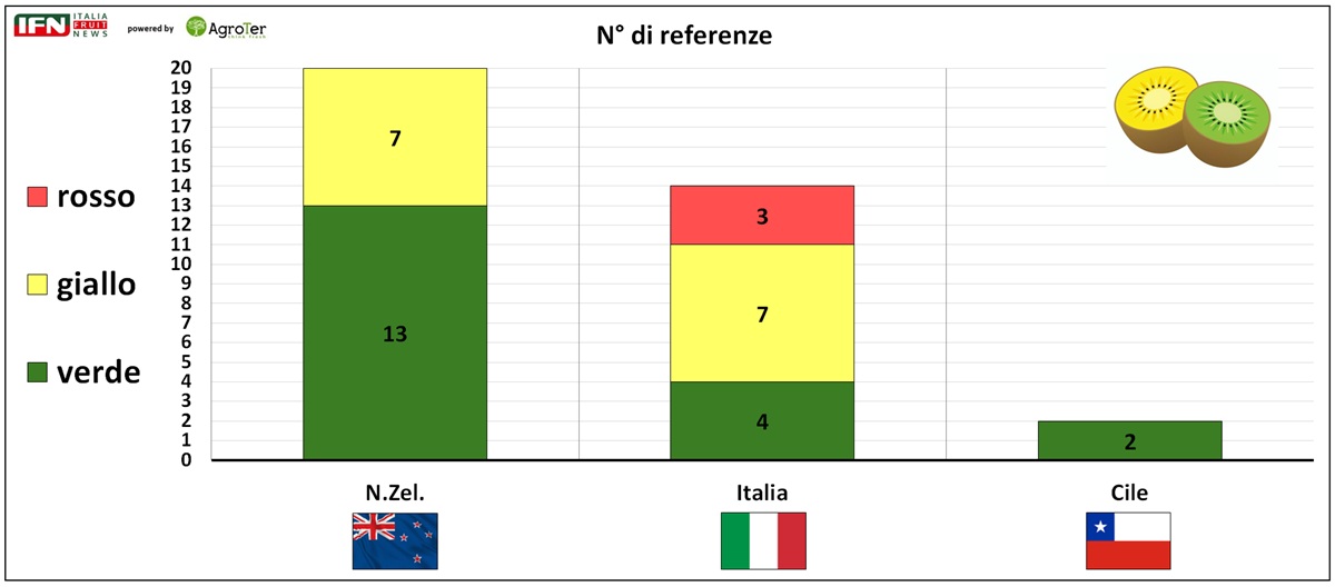 È un periodo di transizione per la categoria dei kiwi: la raccolta del prodotto italiano è in corso ma, in attesa del giusto grado di maturazione, sugli scaffali è presente una quota rilevante di prodotto estero, in particolare proveniente dalla Nuova Zelanda. Quest’ultima rappresenta 20 referenze sulle 36 complessive, pari al 55%, con una prevalenza di kiwi verdi (13) rispetto ai gialli (7). Il prodotto italiano conta invece 14 referenze, pari al 39% del totale: 3 di kiwi rossi, le uniche rilevate, 4 di verdi e 7 di gialli. Dal Cile provengono infine solo 2 referenze, entrambe di kiwi a polpa verde.
