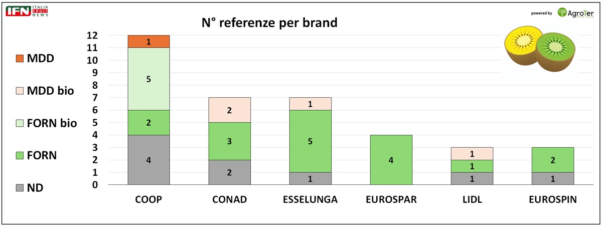 Come anticipato, la categoria dei kiwi mostra una buona presenza di brand e, parallelamente, una bassa incidenza di prodotti anonimi, soprattutto se confrontata con altre categorie dell’ortofrutta. I marchi dei fornitori si confermano particolarmente forti: il prodotto convenzionale conta 17 referenze, pari al 47% del totale, con una netta predominanza di Zespri, che rappresenta oltre l’80% di questa quota. Considerando anche le 5 referenze di prodotto biologico, la presenza complessiva di marchi di fornitore raggiunge il 61%.