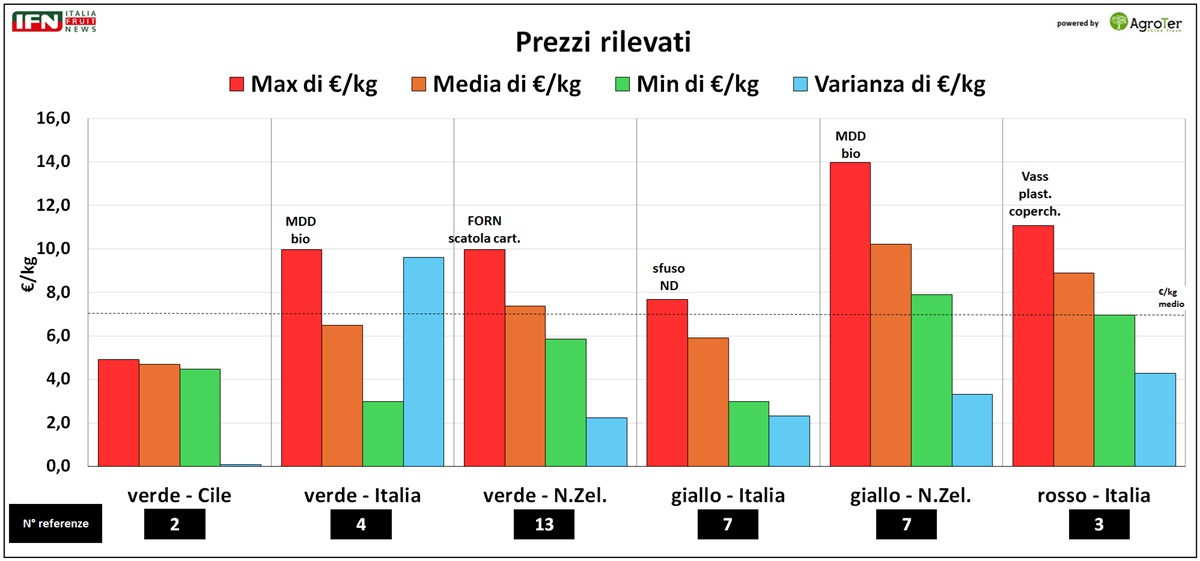 Anche nel kiwi verde, la Nuova Zelanda registra i prezzi più elevati, con una media che supera i 7 €/kg e un picco di 10 €/kg per un marchio di fornitore in confezione di cartone.