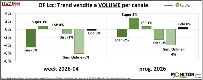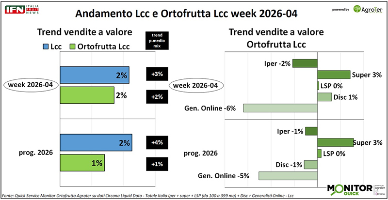 Nell’ultima settimana di gennaio, le vendite a valore di ortofrutta Lcc tornano a crescere dopo la frenata registrata nella settimana precedente. L’incremento dell’incasso è sostenuto principalmente dall’aumento del prezzo medio mix, mentre i volumi risultano complessivamente stabili. Tra i canali, solo i supermercati riescono a mantenere un andamento positivo.