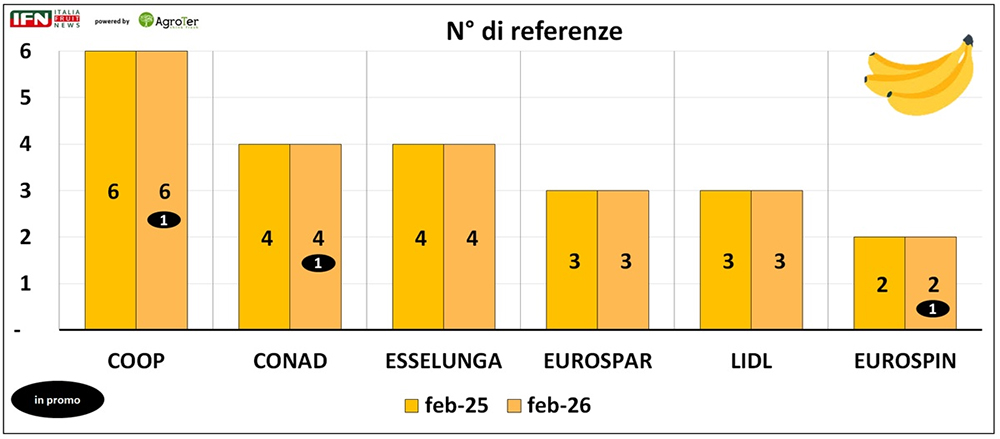 Nei sei punti vendita analizzati, la numerica si conferma contenuta e stabile rispetto allo stesso periodo del 2025. Coop si distingue per l’assortimento più ampio, con 6 referenze, mentre Eurospin presenta l’offerta più essenziale, limitata a 2 referenze; le altre insegne si collocano in una fascia intermedia, con 3-4 proposte.