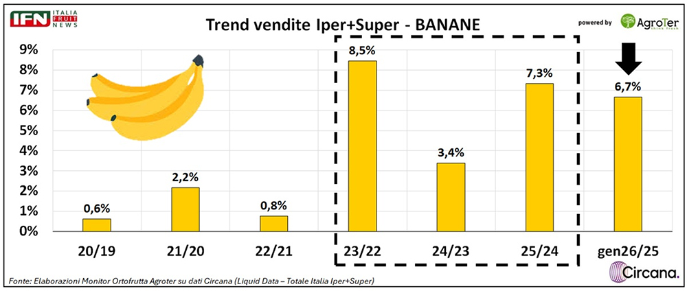 A livello nazionale, le banane rappresentano la prima categoria del reparto a volume e la seconda a valore, in termini di incidenza sulle vendite. Questo significa che anche una variazione percentuale contenuta genera un impatto molto rilevante in termini assoluti.