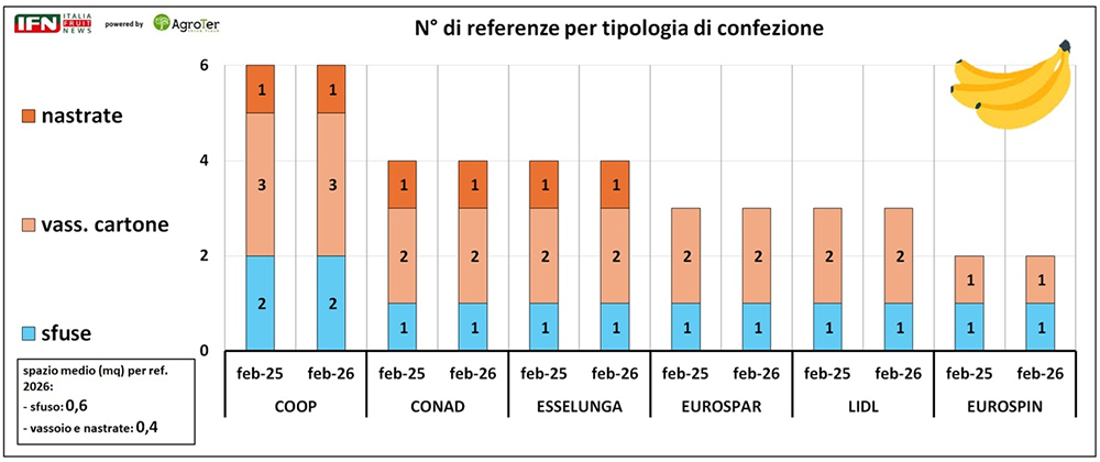 Anche le modalità di vendita mostrano una sostanziale continuità nel tempo. La banana sfusa è generalmente proposta in un’unica opzione nella maggior parte dei punti vendita, ma in termini di spazio espositivo per referenza siamo al 50% in più rispetto al prodotto in vassoio (0,6mq rispetto a 0,4mq), che però è presente con almeno due referenze, ad eccezione di Eurospin.