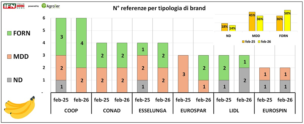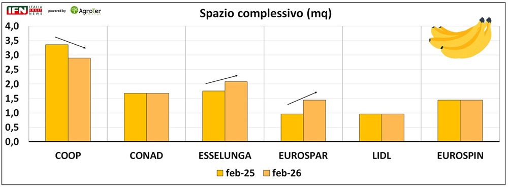 Insegne come Coop, Esselunga ed Eurospin mostrano un equilibrio pressoché perfetto, con una ripartizione 50/50 tra convenzionale e bio. In Conad e Lidl prevale invece la banana convenzionale, mentre Eurospar si distingue per un orientamento più marcato verso il biologico. Anche sotto questo profilo, il quadro rimane invariato rispetto al 2025.
