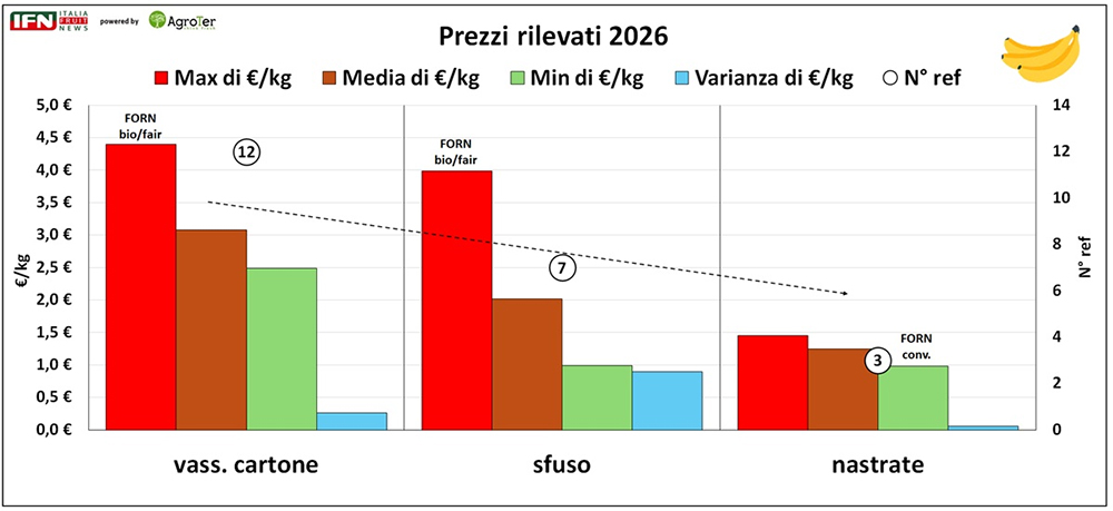 Nella categoria, la variabile che incide maggiormente è la modalità di vendita: il vassoio si posiziona su una media di 3 €/kg, seguito dallo sfuso attorno ai 2 €/kg, mentre le banane nastrate si collocano sotto 1,5 €/kg. Le referenze costose sono quelle biologiche a marchio del fornitore, con prezzi compresi tra 4 e 4,5 €/kg, sia a vassoio sia sfuse e che staccano di misura la media relativa. All’estremo opposto, l’opzione più economica è proposta a 0,99 €/kg, nel formato nastrato a marchio del fornitore.