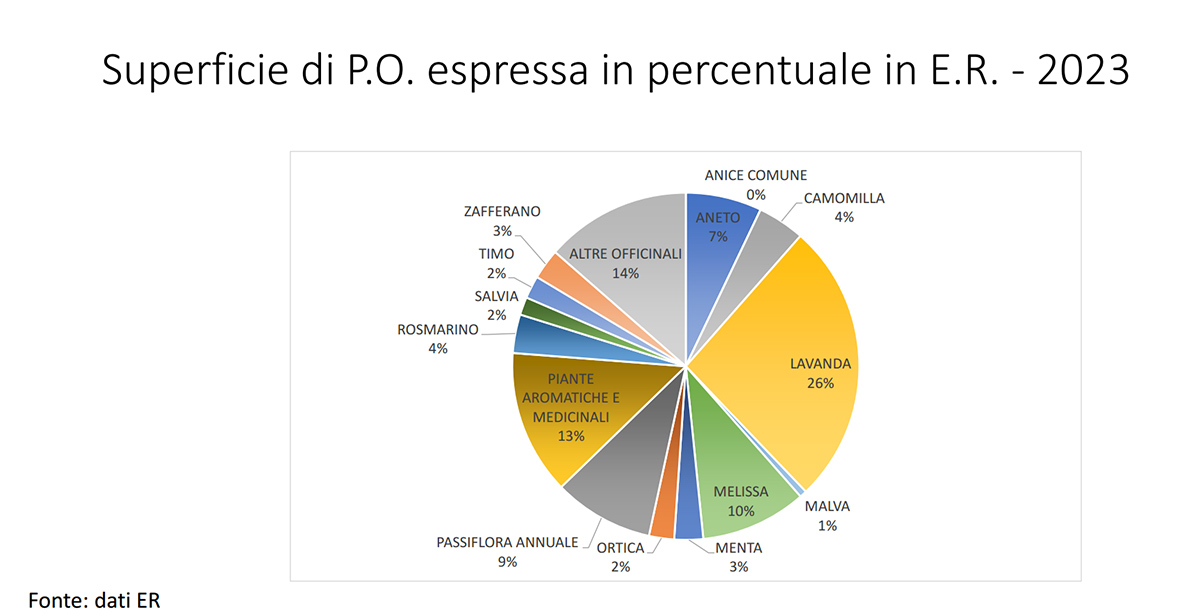 Luca Rizzi della Regione Emilia-Romagna ha fotografato il settore a livello regionale. Secondo i dati forniti la tipologia di prodotto prevalente è la lavanda (26%), seguita dalle officinali di diversa tipologia (14%), le piante aromatiche e medicinali (13%), melissa (10%), passiflora annuale (9%) e aneto (7%). La provincia con la maggiore estensione è Bologna che detiene il 40% delle superfici regionali per lo più dislocate nelle zone collinari, seguita da Forlì-Cesena (18%) con una buona distribuzione tra pianura e collina, e Piacenza (15%).