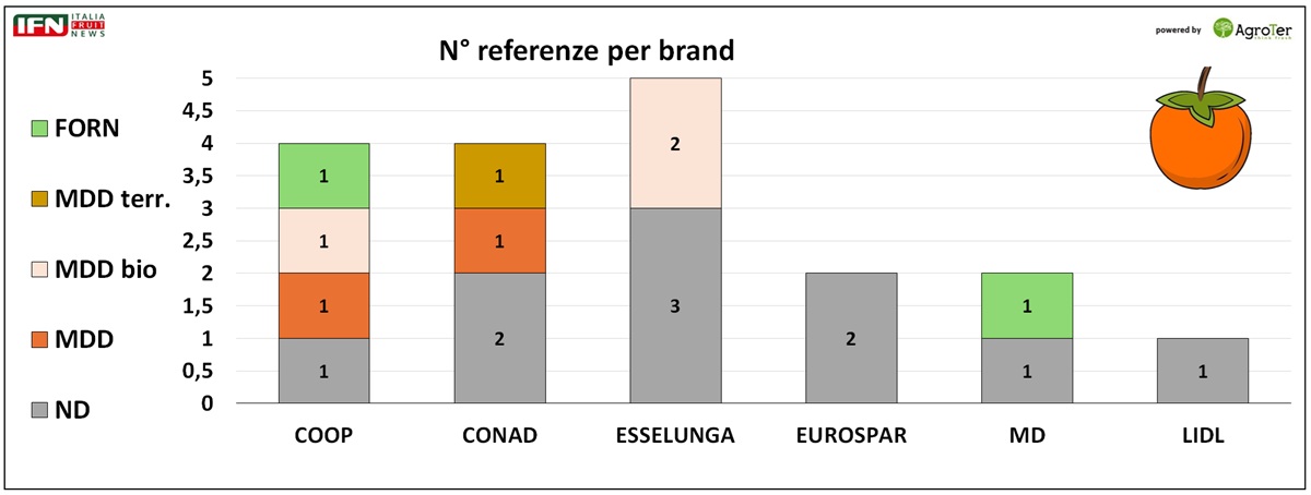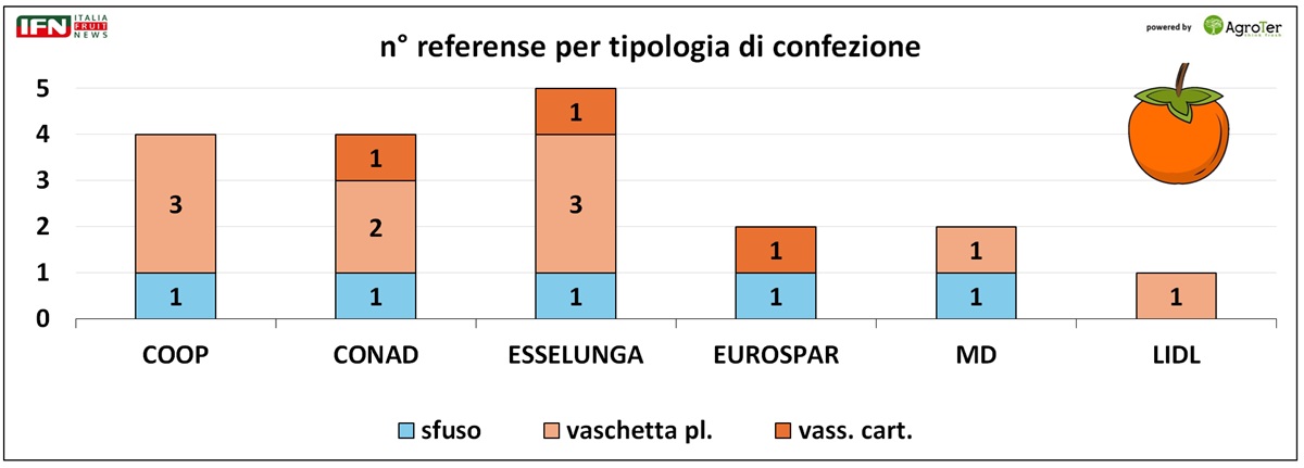 La numerica di referenze evidenzia due strategie distinte nella gestione dei cachi. I due discount, insieme a Eurospar, propongono un assortimento essenziale: una referenza a polpa soda e una a polpa morbida (solo quest’ultima nel caso di Lidl). Le altre insegne, invece, offrono una gamma più ampia, con 4 referenze, che diventano 5 in Esselunga che, pur avendo una superficie di vendita simile a quella di Eurospar, presenta la maggiore profondità assortimentale.