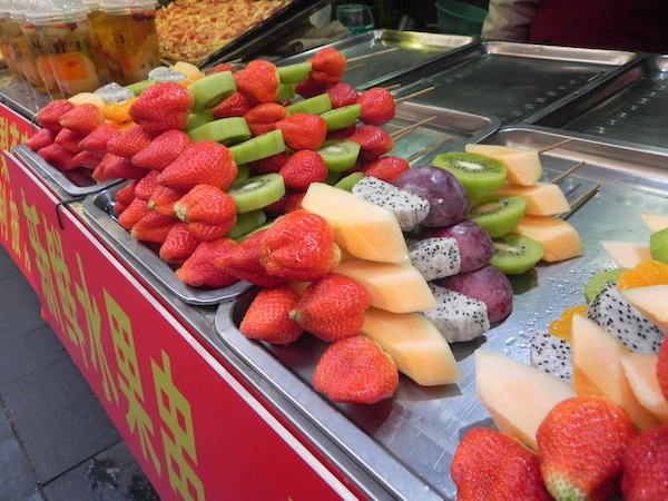 Pechino: dragon fruit protagonista in colorati spiedini di frutta in un mercatino nel cuore della capitale