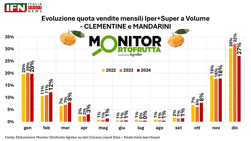 Ad aprire il dibattito è stato Roberto Della Casa, direttore di IFN, che ha richiamato l’attenzione su un dato chiave: lo spostamento dei consumi verso i mesi tardivi. “Se osserviamo l’evoluzione del calendario – ha spiegato – novembre e dicembre stanno progressivamente perdendo peso. Dicembre, che nel 2023 valeva il 32% dei consumi, nel 2024 è sceso al 27%. Sono punti percentuali che non vanno a gennaio, che resta sostanzialmente piatto, ma si spostano su febbraio, marzo e aprile”. Una dinamica che favorisce l’affermazione delle clementine tardive, spesso legate a progetti di innovazione varietale, protetti e gestiti attraverso brand e club, capaci di intercettare nuovi momenti di consumo.