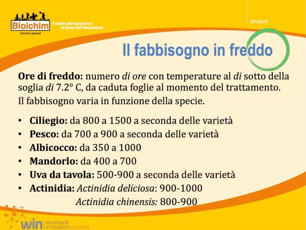 Su actinidia, vite, ciliegio e pesco, al termine di ogni ciclo vegetativo segue una fase chiamata “dormienza”. In questa fase, che inizia con la caduta foglie, il metabolismo della pianta si arresta allo scopo di sopravvivere alle condizioni sfavorevoli che caratterizzano l’inverno. Dopo aver trascorso un periodo di tempo a basse temperature ed aver soddisfatto il cosiddetto fabbisogno in freddo, un nuovo ciclo vegetativo può iniziare. Ma se le condizioni ambientali invernali non sono favorevoli, allora possono nascere dei problemi.