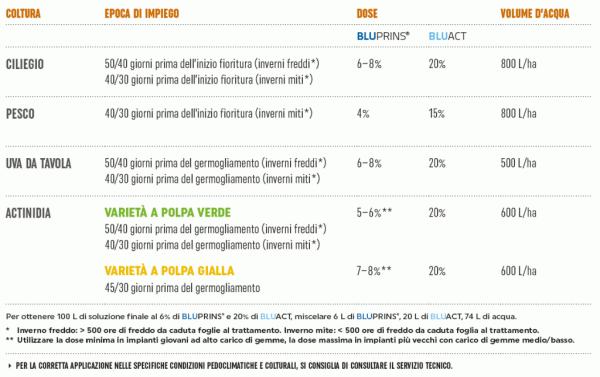 Bluprins è un gel concentrato e deve essere sempre associato a Bluact, un concime fluido a elevato titolo di azoto e calcio che funge da attivatore nutrizionale dell'interruttore di dormienza. Nella tabella sottostante è possibile leggere le indicazioni per una corretta applicazione.