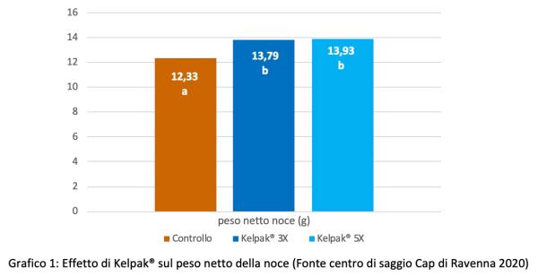 "Tutti gli interventi sono stati fatti con Kelpak® alla dose di 3 l/ha in un volume di 1000 l/ha - illustrano i due tecnici di AlzChem - L’andamento climatico particolarmente favorevole ha garantito un’ottima allegagione in tutte le tesi che non hanno quindi mostrato particolari differenze tra di loro. Ma è alla raccolta che si sono notate le differenze: entrambe le tesi trattate con Kelpak® presentavano infatti un miglioramento sia del peso netto delle noci (Grafico 1) che del peso secco del gheriglio".