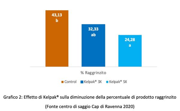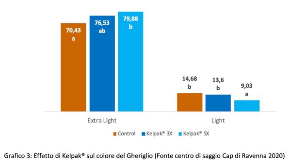 Quindi volumi produttivi migliori, ma anche effetti positivi sul prodotto commercializzabile. "Kelpak® si è inoltre dimostrato particolarmente efficace nel migliorare alcuni parametri qualitativi diminuendo l’incidenza del raggrinzito (Grafico 2) e migliorando il colore del gheriglio che, nelle tesi trattate, è sempre risultato essere più concentrato nella categoria extra light (Grafico 3) - aggiungono D'Onza e Papa - La tesi con 5 trattamenti ha sempre garantito le performance migliori. Dai risultati ottenuti dalla prova condotta in collaborazione con il centro di saggio del Cap di Ravenna possiamo concludere che Kelpak® è stato in grado di influire positivamente su alcuni parametri qualitativi importanti come il peso netto della noce, il peso secco ed il colore del gheriglio, diminuendo così l’incidenza di prodotto raggrinzito e migliorando quindi significativamente la produzione lorda vendibile".