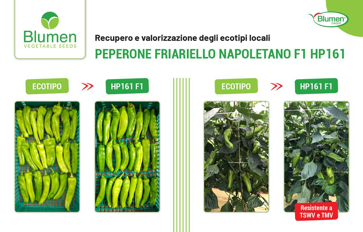 Il lavoro di recupero degli ecotipi locali di Blumen Vegetables Seeds si estende anche al pomodoro pera d’Abruzzo BL 97 su cui ha migliorato produttività, pezzatura, uniformità del palco ed estetica dei frutti; al peperone friariello napoletano ibrido HP 161, progetto condotto dal breeder Mariano Giannone. Rispetto alla varietà originaria, HP 161 mantiene le stesse caratteristiche ma risulta più uniforme, con buccia liscia e sottile, più produttiva e resistente alle principali fitopatie.