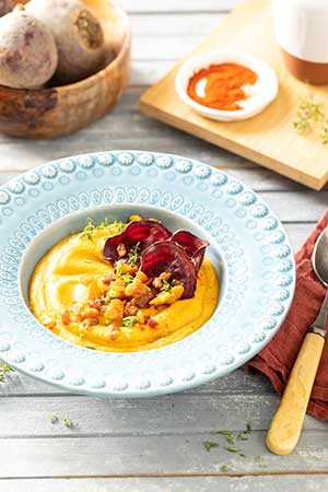 Crema di patate dolci e Tempeh con chips di barbabietola