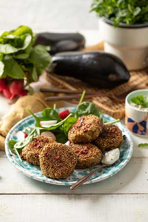 Per prima cosa lavate le melanzane, tagliatele a metà e incidetele con la punta di un coltello formando una sorta di griglia. Conditele con olio, un pizzico di sale e di pepe e cuocetele in forno a 200°C per 20 minuti circa, fino a che non si saranno ammorbidite bene. Scavatele con l’aiuto di un cucchiaio per ricavare la polpa e mettetela in una ciotola assieme al Tempeh l’Originale Compagnia Italiana e agli altri ingredienti. Mescolate fino a formare un impasto compatto e modellabile (eventualmente potete aggiungere ancora un poco di farina di riso o di mandorle) e, se necessario, condite con un pizzico di sale. A questo punto formate con le mani una decina di polpette medio-grandi, impanatele con dei semi di sesamo e cuocetele in padella con dell’olio per qualche minuto da entrambi i lati. Dovranno diventare belle dorate e croccanti all’esterno e rimanere morbide dentro. Per la salsa, in una ciotola unite lo yogurt, un filo di olio, un pizzico di sale e di pepe e qualche foglia di menta tritata. Mescolate bene per incorporare gli ingredienti e condite con la scorza del limone grattugiata. Servite le polpette belle calde e servitele con la salsa yogurt e con un’insalata fresca di spinaci e ravanelli.