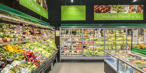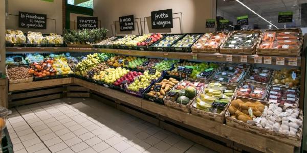 Francesco Pugliese. Sopra e sotto, reparti ortofrutta di Conad