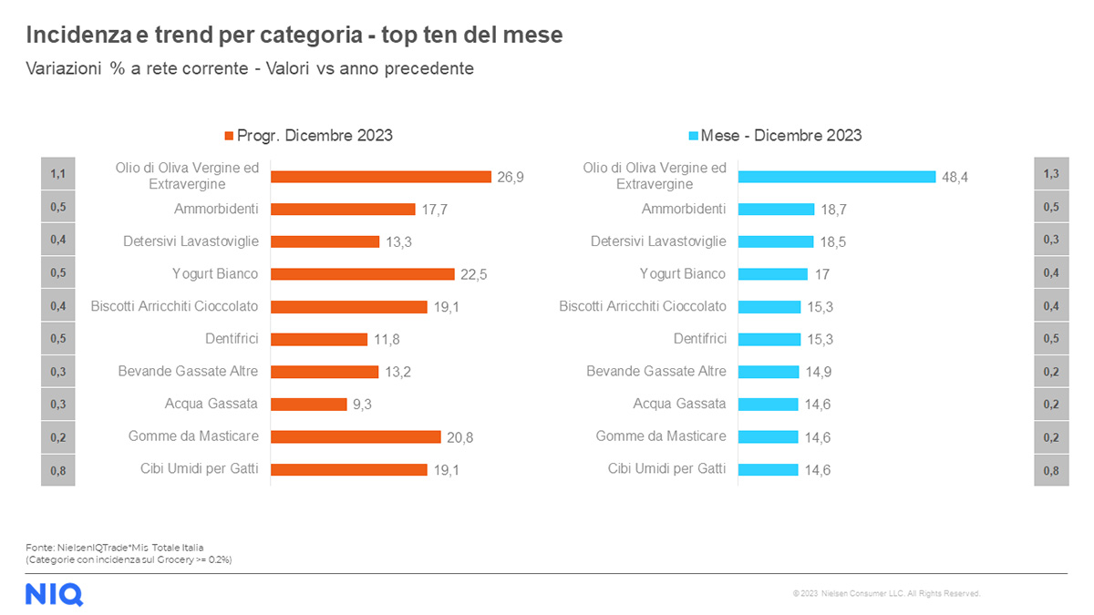 A livello di categorie merceologiche, in testa alla classifica Top10 di NIQ del mese di dicembre 2023 si classificano l’Olio di Oliva Vergine ed Extravergine (+48,8%), L’Ammorbidente (+18,7%) e i Detersivi Lavastoviglie (+18,5%).